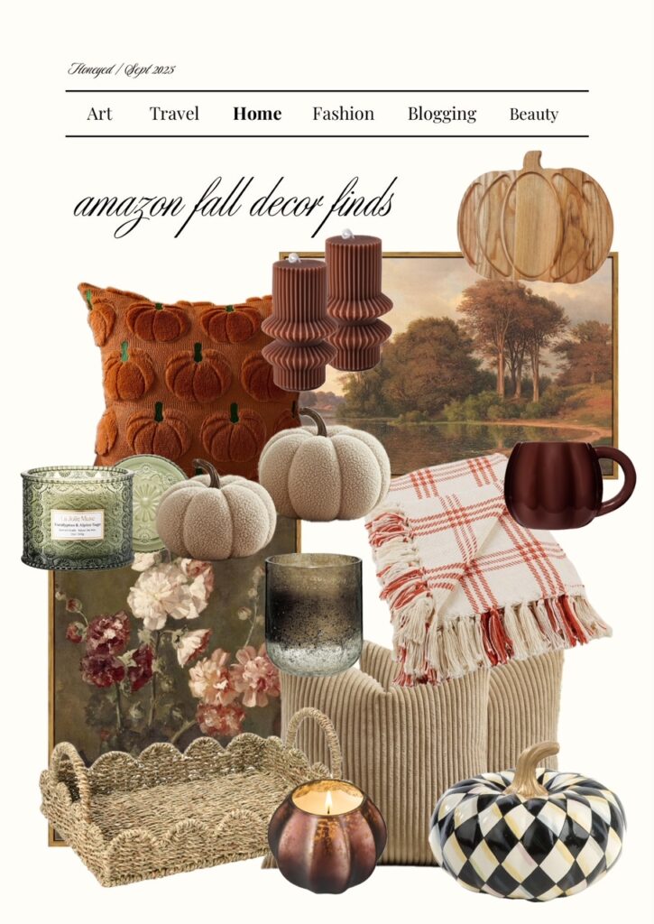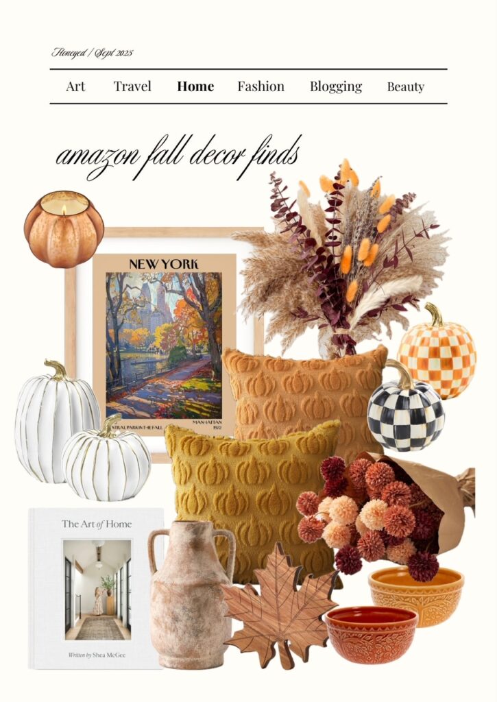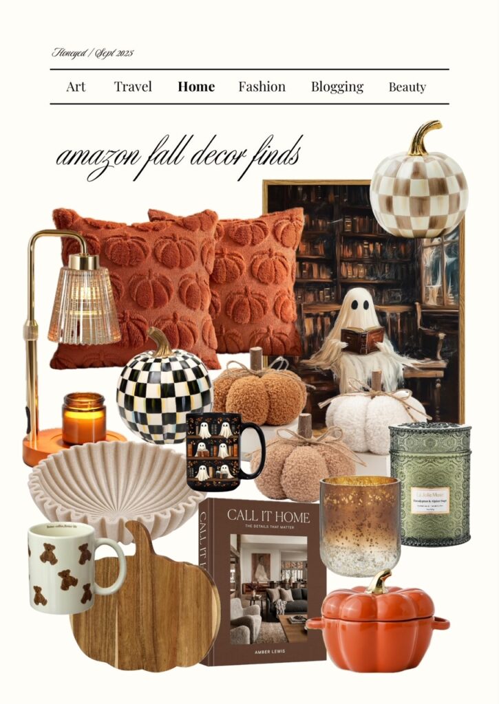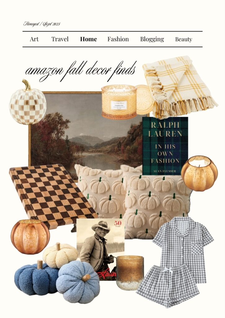 To elevate your space this Fall, I would change out the pillows, curtains, and blankets in the living room. Update your coffee bar or kitchen counter space with fall mugs and wooden cutting boards. Arrange some fall candles in your entryway, along with a new wall art piece and you’ll have a quick home transformation for the season. My Amazon home fall picks are the checkered cutting board, Ralph Lauren coffee table books, teddy bear mug, wicker tray, and Mackenzie Childs ceramic pumpkins! Save this post for later on Pinterest. Happy shopping!