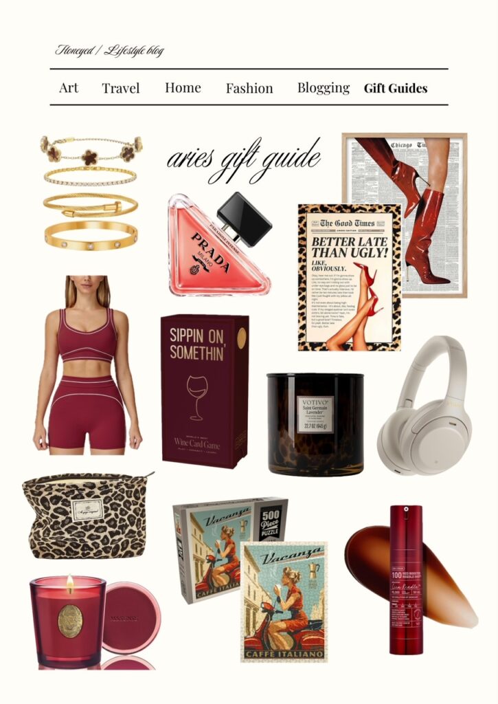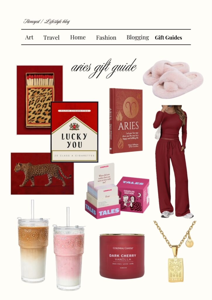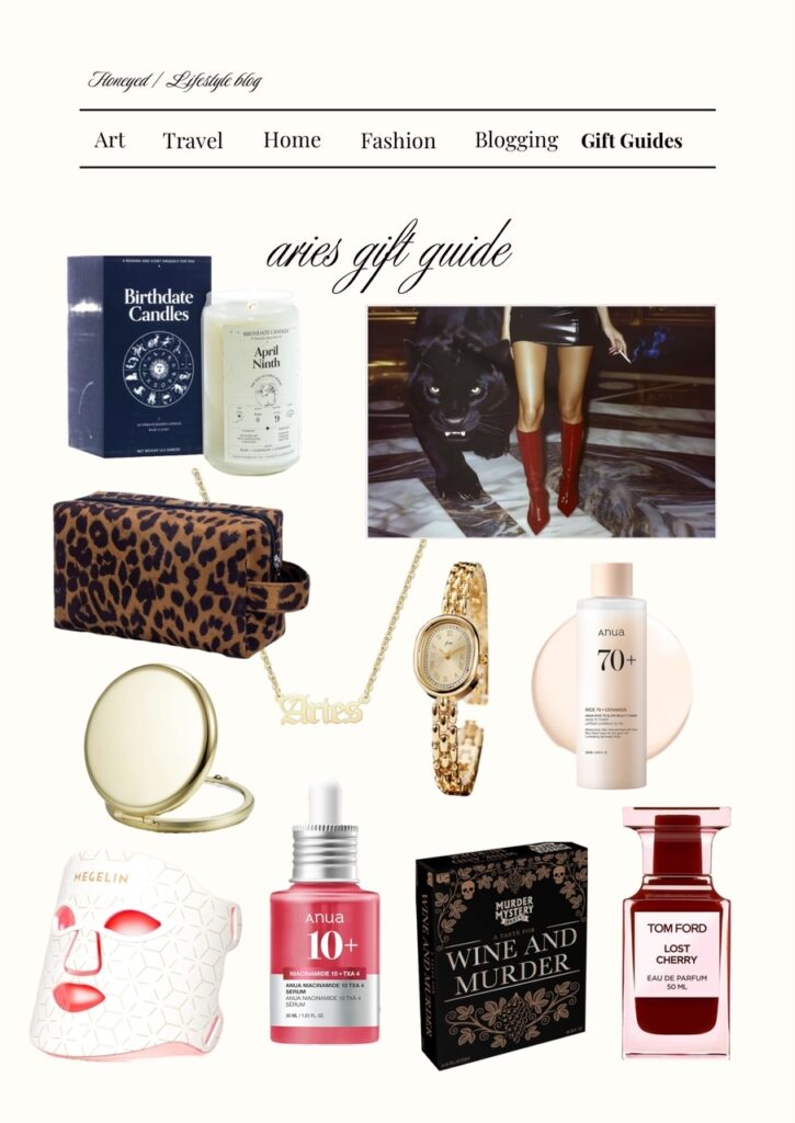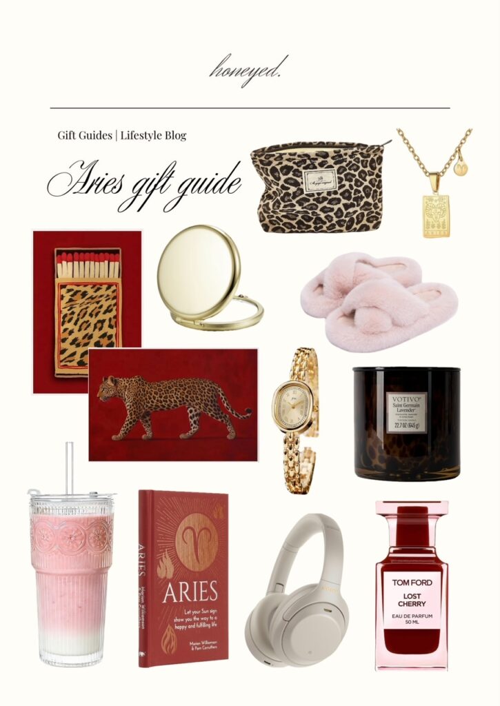 If I was creating a birthday basket for my fav Aries girlfriend, I would include the leopard and matches posters. They look so iconic together. I would also choose the pink fuzzy slippers, the cheetah printed candle and the cheetah printed toiletry bag to match as some cute personal items she’ll use every day. To complement her hobbies, I would choose a fun card game like the wine & murder set and red light mask because what girly doesn’t love skincare?? To top it off, I would add the gold pocket mirror for her purse and the Tom Ford lost cherry perfume. You can’t go wrong with the fun and flirty pieces curated below. It’s sure to make your Aries bestie feel super special. Happy Aries Season!