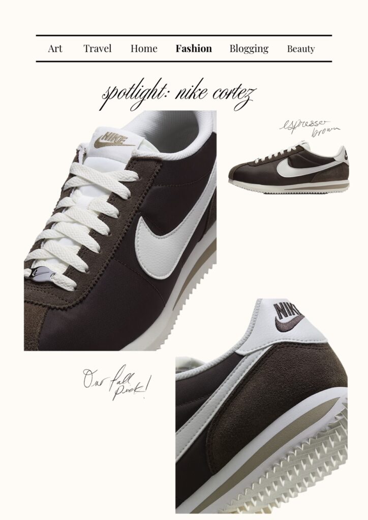 Your next statement sneaker, the nike cortez trainers are comfy and stylish. The perfect retro sneaker comes in easy to style colors, bold accents and different textures. Personally have the khaki white and cacao brown combo and they are perfect for fall and super comfy. If you’re looking for a sneaker to go the distance on a walking vacation, these will def hold up. Being the first track shoe nike released in 1972, the cortez is a Nike icon. Not only iconic, but comfortable, durable and cute as hell. A must have for your sneaker collection.