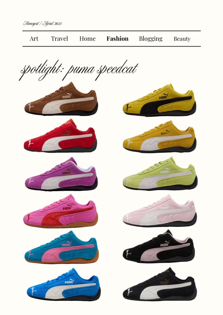 The fall it girl sneaker is here! As a big lifestyle sneaker girlie (I’m always in Europe & I walk literally everywhere) I have been eyeing the puma speedcats since Spring. I am loving the bold colors and their classic feel. And since we’re in a big 2000’s renaissance, I feel Puma is on the verge of a major comeback. Back in the day I had the most gorgeous pair of chocolate brown puma speedcats and I just needed to add these back into my wardrobe. I’ve been loving bright reds as my statement color this Summer and I want to pull that color scheme now through the Fall. So recently I pulled the trigger and got myself the red Puma Speedcats! They were filling my Pinterest mood board and to me, they make the perfect statement sneaker. Which bold color caught your eye?